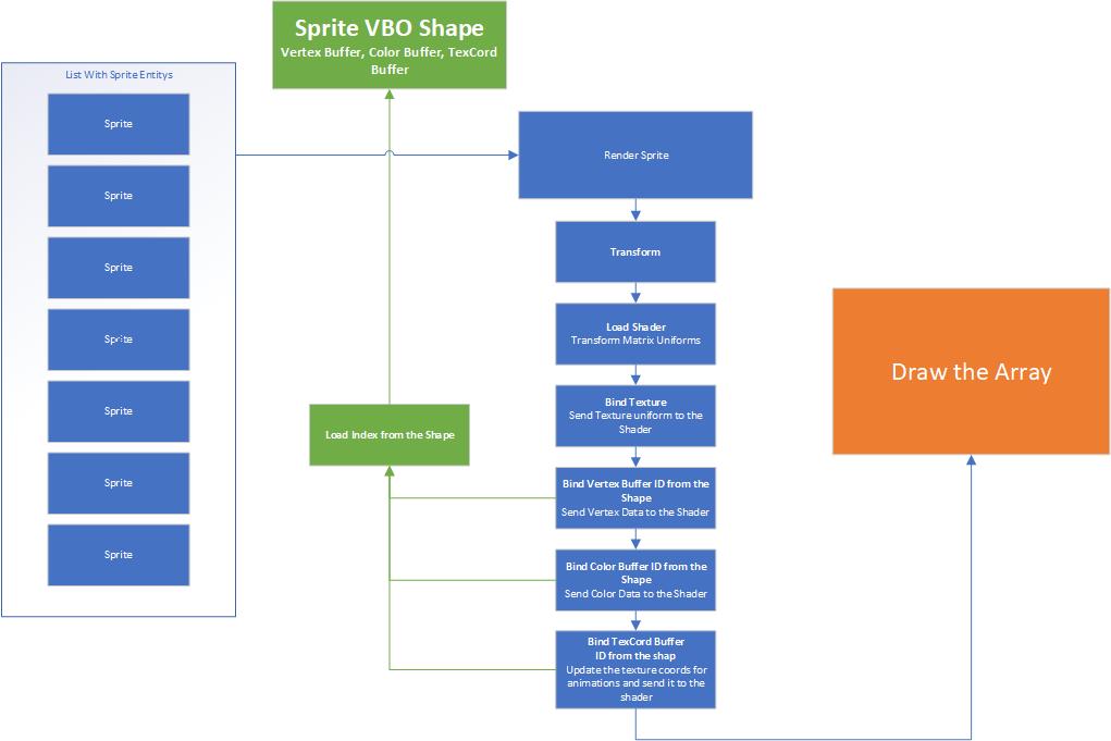 Da die Vertexdaten immer gleich sind, überlege ich, ein Strukt zu erstellen, das die Indexwerte für den Vertex Buffer, den Color Buffer und den TextCord Buffer speichert. Jedes Sprite würde dann auf diese gemeinsamen Buffers verweisen. Bei der Initialisierung würde dieses Strukt erstellt und die Buffers würden generiert. Während des Renderprozesses würden sich die Texturkoordinaten für animierte Sprites ändern. Das Ziel dahinter ist, nicht für jedes Sprite separate Buffers zu haben, sondern nur einen Vertex Buffer, einen Color Buffer und einen TextCord Buffer für alle Sprites.