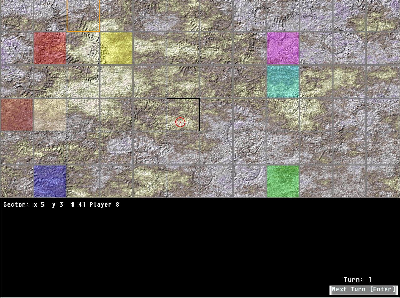 Mein Beitrag zur dritten Action soll etwas Ähnlichkeit mit Civilization haben. Auf einer in quadtratische Sektoren eingeteilten Planeten-/Mondoberfläche muss man militärisch gegen andere (KI)Spieler bestehen (heißt alle vernichten/erobern).