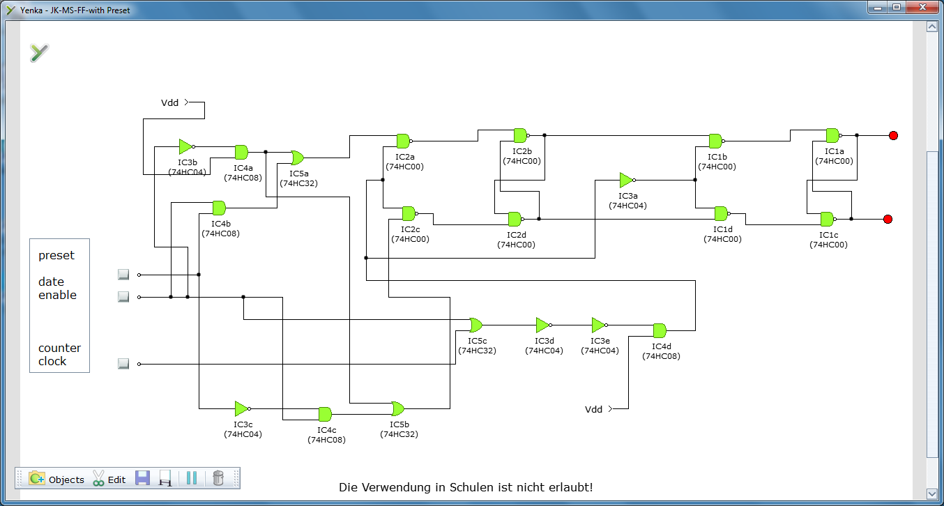 Hi zusammen ! Als Anhang ein screenshot bezüglich meiner aktuellen Arbeit an meinem eigenen Computer. up-counter with preset.png Das Ganze (screenshot) ist der elementare Teil eines Binärzählers. Hier noch 1 bit groß. Dieser wird dann programmatisch automatisiert auf 128bit hoch berechnet. Das Progr...