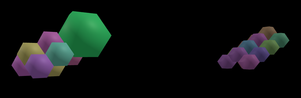ich probiere noch mal einen zweiten Ansatz, der keine Seams braucht, aus: rhombusförmige Voxel. Ein bisschen organischer als cubes und im Shader mische ich dann die Materialien zusammen, d.h. weiche Übergänge von Sand nach Gras sind auch über längere Strecken stabil möglich