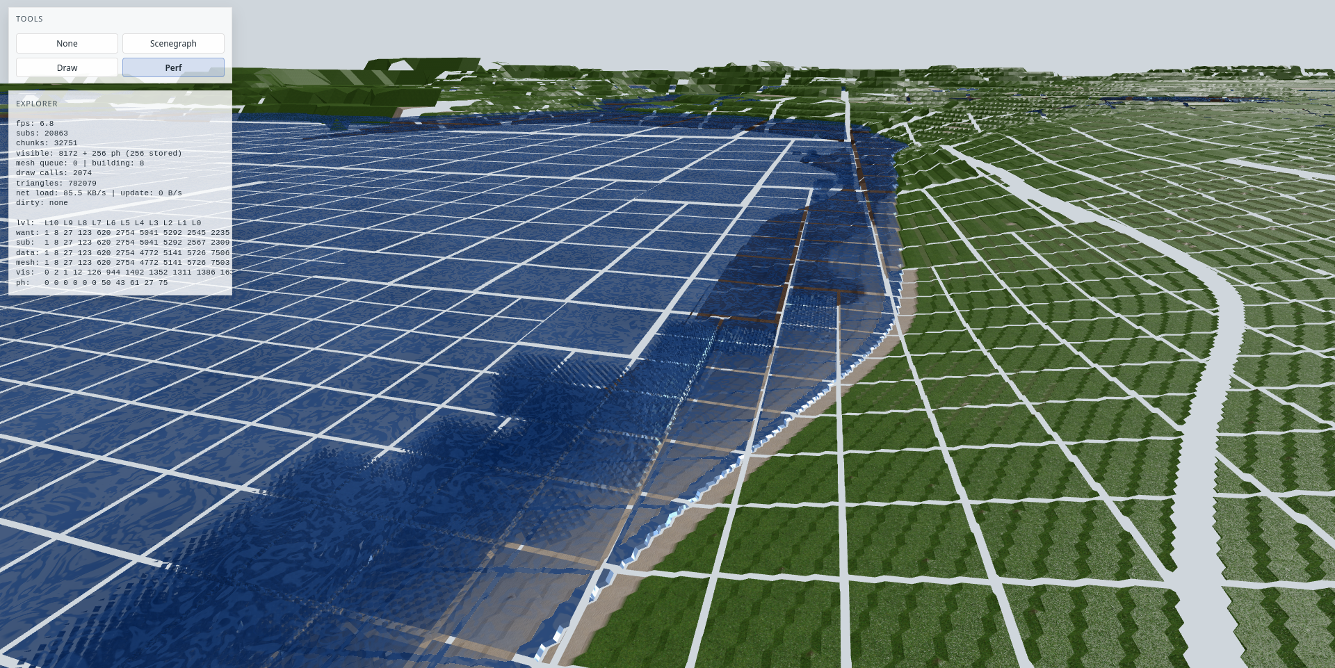 Hm? Ich seh's nicht. Wenn die weißen Linien Block-Ränder sein sollen, dann verkackt Deine LOD-Berechnung doch sichtbar? Am Rand weiter höchste Auflösung als in der Mitte? Müsste uniform sein, oder sogar andersrum. Naja, wenn Du zufrieden bist, reicht's ja. nein, die Ränder habe ich noch bewusst lee...
