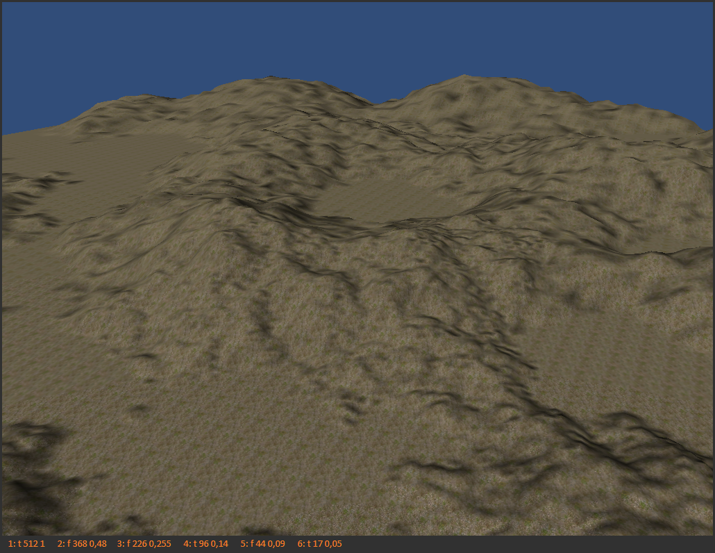 Das Terrain ist 1024*1024 mit 1 Einheit (m) Auflösung gleichmäßig texturiert in Unity. Die einzelnen Octaven sind unter den Bildern angegeben. Es handelt sich teilweise um sogenannten ridged noise wo anstatt Werte zwischen -1 und +1 nur absolute Werte benutzt werden weil das das Terrain schöner machen soll. Wenn es aber auf alle Octaven angewandt wird sieht es blöd aus.