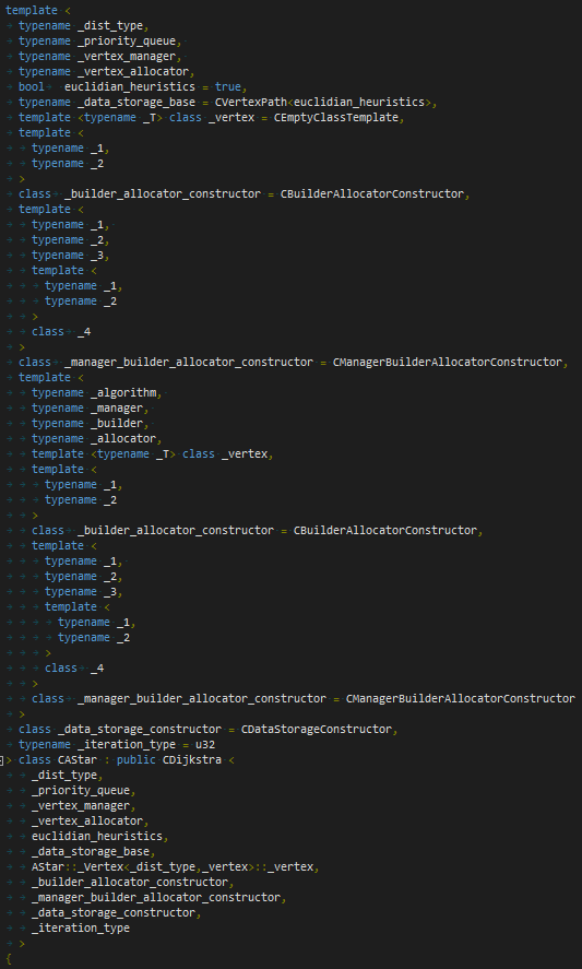 Das – von template ganz oben bis zur geschweiften Klammer ganz unten – ist die Deklaration einer Klasse. Die Klasse an sich realisiert einen A*-Algorithmus, also Wegfindung für die KI. Und sie kompiliert nicht. Jede Spezialisierung schmeißt einen 30 Zeilen langen, aber ansonsten nichtssagenden Syntaxfehler.