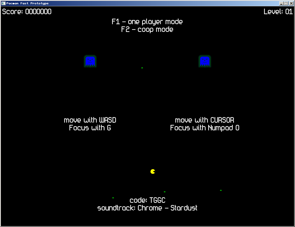 Im Sinne der Richtlinien wollte ich eine ungewoehnliche Idee und eine ungewoehnlichere Steuerung in mein Gameplay integrieren. Das ist in diesem Fall das Vertauschen der bekannten Rollen und die Fokussieren Faehigkeit des Geistes. Das ist Ich hoffe der Prototyp kann davon ueberzeugen, das man damit seinen Spass haben kann. Ausserdem deckt sich auch der Punkt Nahrung recht gut, schliesslich dreht sich hier alles um die Nahrung von Pacman!