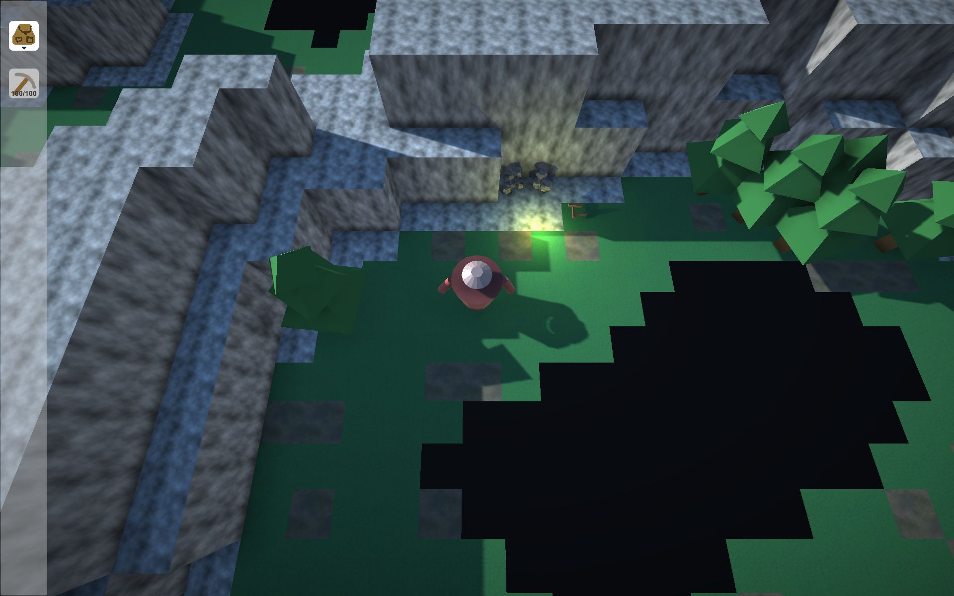 Ansonsten: Auf der linken Maustaste länger draufbleiben, auf den Boden des gewünschten Tiles zielen, und nicht wegrutschen mit der Maus. Dann macht es so viermal "Puff" und das Tile wird zerlegt. Dass der Landschaftsgenerator gern mal den Startpunkt auf ne kleine Insel legt, ist leider ein Problem, dass ich während der 3 Tage nicht zu lösen versucht habe. Wäre ein Ding für später.