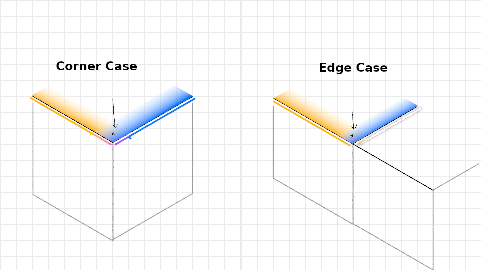 Ne, auch paar diskrete andere. Aber so in der Richtung grübele ich auch gerade: "freie Fläche" und "nahe einer Kante" funktionieren bereits, nur der "nahe zwei Kanten"-Fall scheitert. Und wenn ich den erkenne und als Quad-Interpolation getrennt behandle, kriege ich wahrscheinlich eine geschlossene konsistente Oberfläche hin.