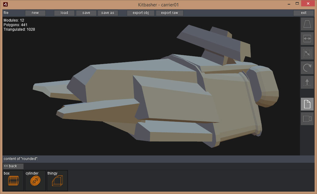 Was ich diese Tage mache, wird keine Weiter- sondern eine komplette Neuentwicklung eines recht ähnlichen Tools sein: Ich möchte das "Bashen" gerne in mein Tool selbst verlagern. Und dabei aus einer vorher angelegten Shape-Bibliothek (Ordnerstruktur auf Platte) bequem Einzelteile auf die Arbeitsfläche ziehen und modifizieren können. Gut, das können viele 3D-Programme. Mein Tool soll aber vor allem ohne 3D-Kenntnisse und steile Lernkurve bedienbar sein, aso sehr schlank bleiben, und non-destruktiv arbeiten wie beim Shape-Basher.