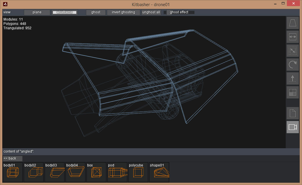 Ghosting: Um an verdeckte Stellen zu kommen, kann man selektierte Module auf "ghost" stellen, diese werden dadurch wireframe-transparent und nicht mehr selektierbar. Auf diese Weise kann man sich durch gebaute Schichten "hindurchklicken" und bequem auch im Inneren arbeiten.