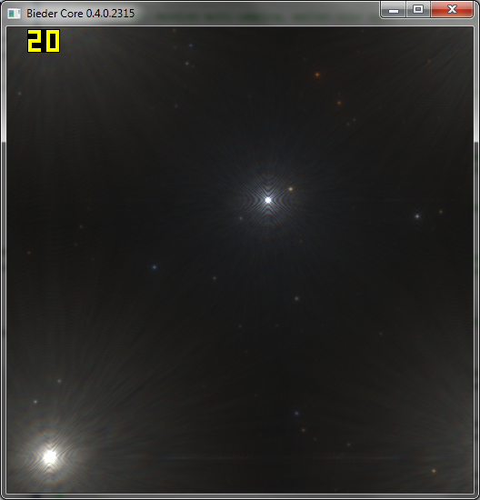 So, der Prototyp für 512×512 steht und läuft mit 21 fps. Die Rundungsfehler machen sich nicht bemerkbar, FUCK YEA! Aus irgendeinem Grund habe ich keine Farben … da habe ich wohl irgendwo eine Implicit Vector Truncation oder so; kann sich nur um Minuten handeln, bis ich das habe. Indes:Dort sieht man den (leider noch streifigen) Schein um den hellen Stern rechts am linken Rand wieder auftauchen. Bei der Sonne ist das tausendmal schlimmer; dort kann man vor lauter Spiegelungen garnicht mehr sehen, an welcher der vier möglichen Positionen sie sich überhaupt befindet. Ich will Ideen hören!