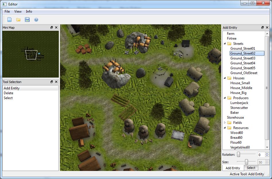 Als nächstes kommt aber ersteinmal das editieren von einzelnen Objekten an die Reihe: Man kann alle Objekteigenschaften in einem Property Browser editieren. Wird auf jeden Fall nochmal ein ganzes Stück Arbeit, aber wenn das läuft, kann man nicht nur alle Objekte im Level ändern, sondern auch komplett neue Entities erstellen (bisher werden für die Liste Rechts nur die Modelle geladen), die man dann in die Welt pflanzen kann. (Ich nehme Beispielsweise einen Holzfäller, ändere das Modell und verdoppel die Produktionsrate und nehm ihn als Level2 Holzfäller in die Liste auf). Ich freu mich darauf :)
