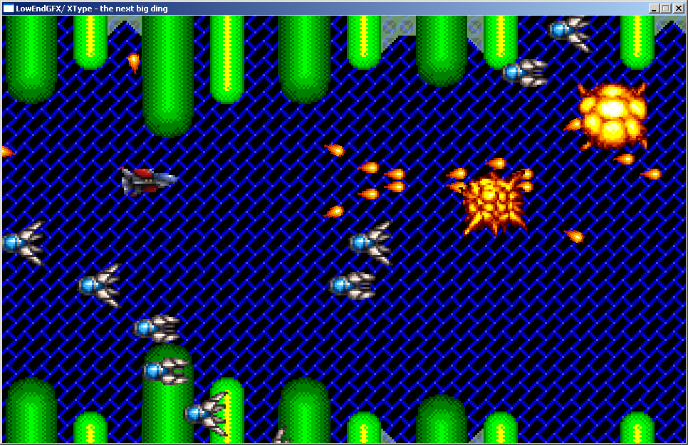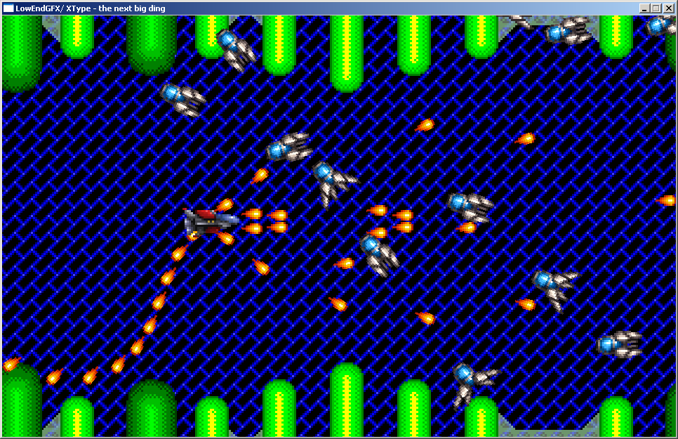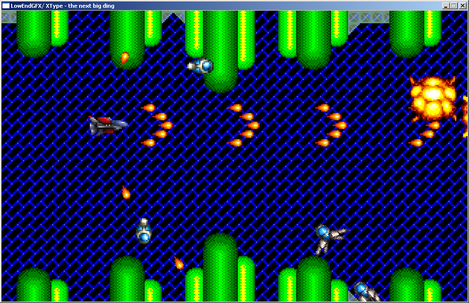Ich habe vor drei Jahren mal angefangen ein Remake eines Sidescrollers im Stile von R-Type zu machen. Das ganze habe ich in C++ geschrieben, benutzt werden HGE (uebrigens nachdem ich SFML getestet habe und ein 5tel der FPS errreicht habe), lua und tinyxml. Das ganze ist prinzipiell so angelegt, das eine Bildschirmaufloesung von 320x200 benutzt wird. Nur durch Scaling erreicht man groessere Aufloesungen.