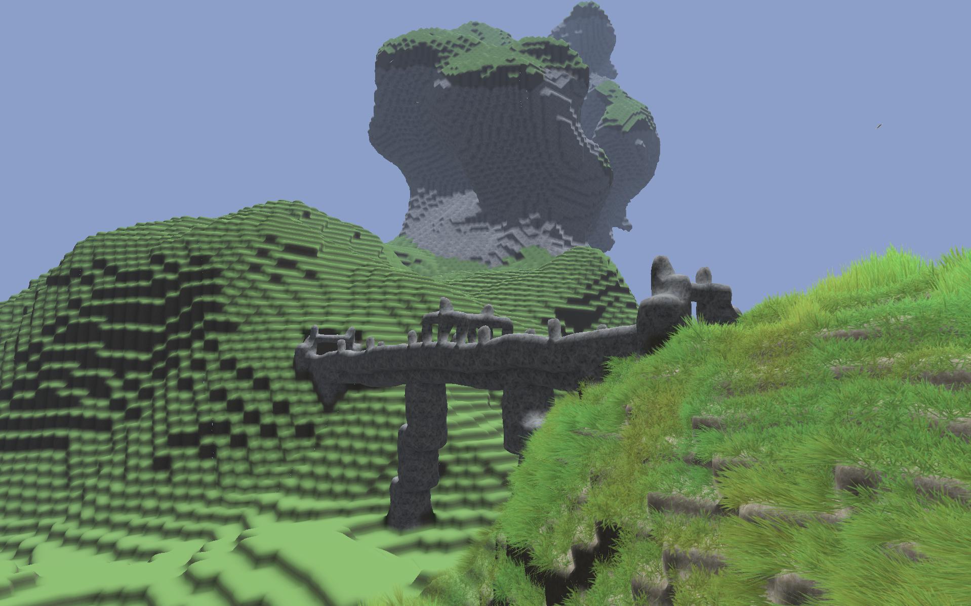 Ne, im Moment gehen keine geraden Flächen. Die Überlegung ist eh, ob ich nicht weg gehe von dem aktuellen abgerundeten Flächen und stattdessen "richtige" Objekte nehme. Das generieren der Landschaft wäre dadurch schneller und ich könnte die Blöcke dann auch losgelöst bewegen... da stelle ich mir z.B. einen Drachen vor, der einen hohen Turm attakiert und dabei ein paar Blöcke rausreist, die dann zu Boden purzeln.