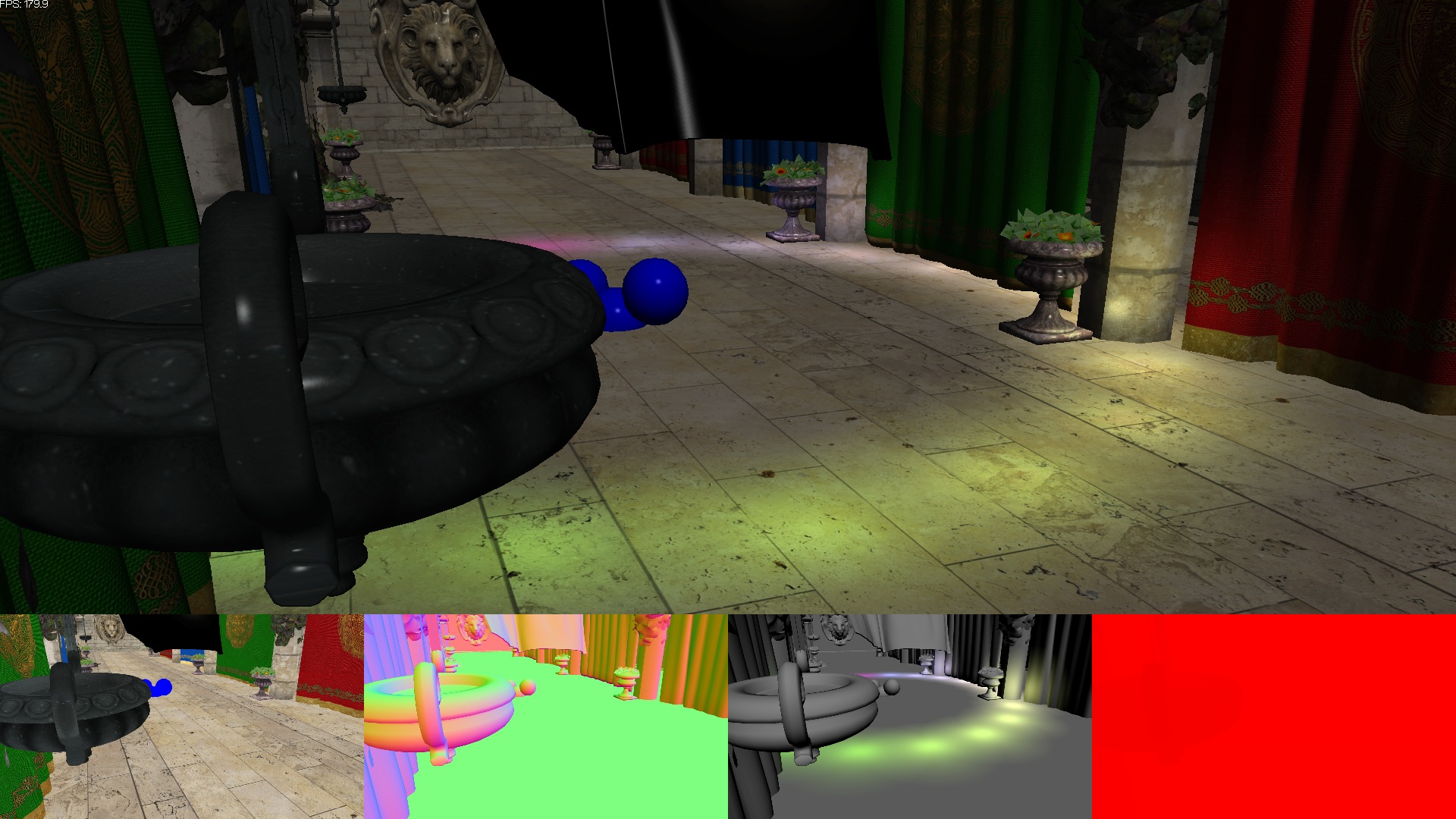 Auf dem Bild sieht man den aktuellen Stand meiner "Engine" mit Directx10. Es ist mein erster Versuch mit Deferred Rendering und es ist eigentlich einfacher als beim normalen Rendering, gerade bei der Beleuchtung. Implementiert sind derzeit Directionale und Pointlights. Der FPS-Text wird mit einem Geometryshader erstellt. Als nächstes werde ich probieren die finalen Blends (Diffuse, Light, später auch Shadow) in das fertige Bild per Computeshader durchzuführen. Dann dürften alle coolen Features von DX10 integriert sein.