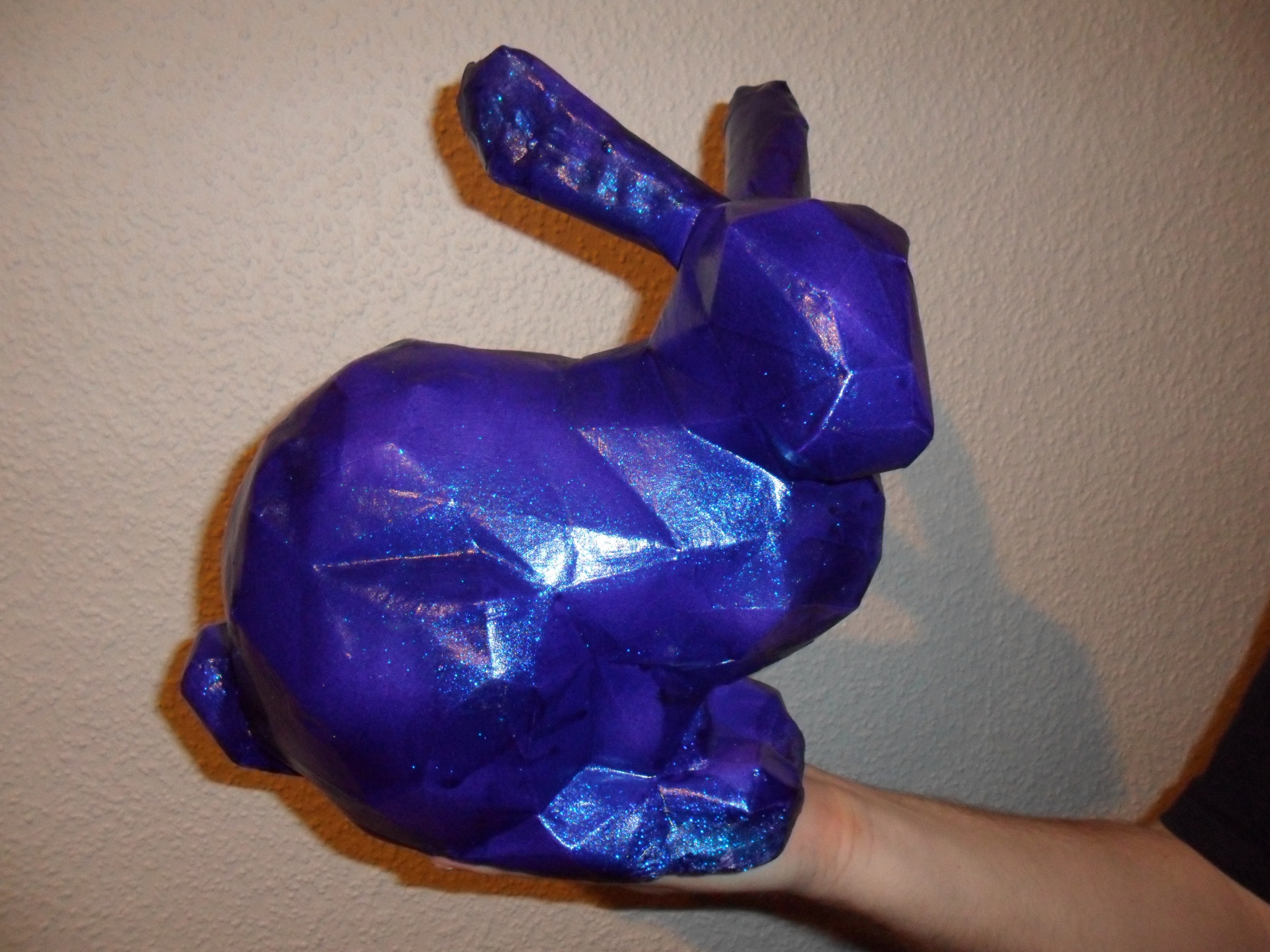 Mein Projekt ist diesmal nicht das Lichtsystem als solches, sondern das Objekt, was auf den Fotos zu sehen ist... das Stanford Bunny, aus Papier nachgebaut... dann mit PU-Schaum gefüllt. Von außen mit weißer Latexfarbe angestrichen. Die Sohle und die gröbsten Macken noch mit Gips behandelt. Hätte ich wohl danach auch noch streichen sollen, aber dafür fehlte mir die Geduld.