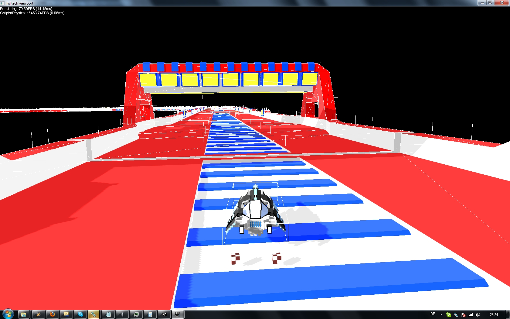 Es geht um die Physik unseres Spiels Pulsedrive. Hier erstmal ein Bild des Schiffes und der Strecke, damit jeder versteht worum es eigentlich geht: Im Moment ist das Schiff als Raycast-Vehicle umgesetzt. Dh. es gibt einige unsichtbare Federn unten drunter, die es oben halten. Das funktioniert soweit auch gar nicht schlecht, es gibt eben nur diese Probleme, wenn man etwas schneller fahren möchte. Dann fällt man durch den Boden, steckt in den Wänden bzw. fliegt durch, oder wird sonstwo hin geschleudert.