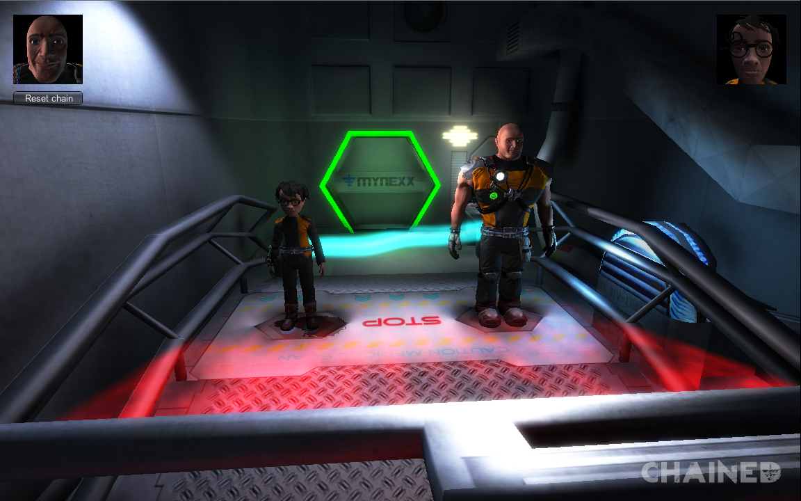 Chained ist ein Action-Adventure in dem zwei durch eine Energiekette verbundene Insassen aus einem Sci-Fi Arbeitslager ausbrechen müssen. Durch das Verwenden der Kette als einzige Waffe und die Kombination ihrer unterschiedlichen Fähigkeiten müssen sich diese durch Scharen von Kampfrobotern kämpfen und knifflige Rätsel lösen, um den Weg zur Außenwelt zu finden.