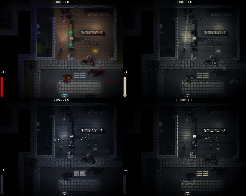Und jetzt zur Meinungsfrage. Ein alter Freund hat mir vor kurzem ein Mockup geschickt, wie die InGame-Grafik besser zu den schwarz-weiß-roten Film-Noir-Grafiken aus den Cutscenes und dem Menü passen könnten. Der Effekt sah verdammt gut aus, war aber nicht spieltauglich - auf Schwarz-Weiß-Comic-Optik gedreht waren große Bereiche des Spiels entweder komplett schwarz oder komplett weiß. Ungünstig. Ich habe aber trotzdem ein wenig mit dem PostProcessing herumgespielt und dabei festgestellt, dass praktisch *jede* Änderung eine optische Verbesserung darstellte. Deprimierend. Aber gut: hier eine Reihe Bilder, und mich würde interessieren, was euch davon gefällt. Das Orginal ist jeweils vorangestellt.