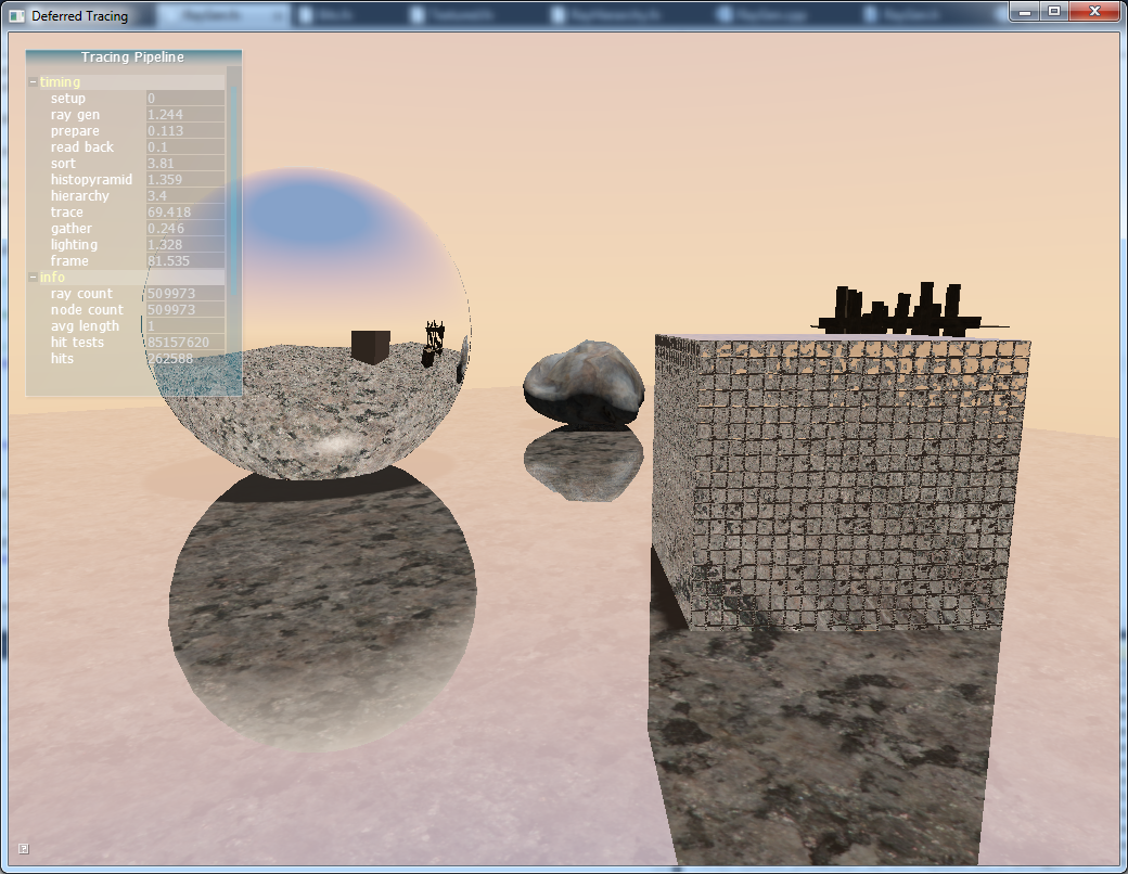 So, nächster Ansatz, basiert auf Ray-Space Hierarchies. Bis jetzt eine ziemlich unveränderte Implementierung des Papers. Diesmal sogar gleich mit Engine Integration inkl. Deferred Shading der Sekundärstrahlschnitte (wenn auch aus Bequemlichkeit im Shader Code gerade ohne Schatten). Oh und ich sehe gerade, ich habe vergessen, die Normal Maps in den Sekundär-G-Buffer rauszuschreiben. Und sollte das ganze je anwendungstauglich werden, wäre es wohl ratsam, zumindest noch eine Tetiärreflexion mit der Himmelsfarbe durchzuführen. Der helle Fleck auf dem Boden in der Kugel ist wohl die Specular Reflection der Sonne.