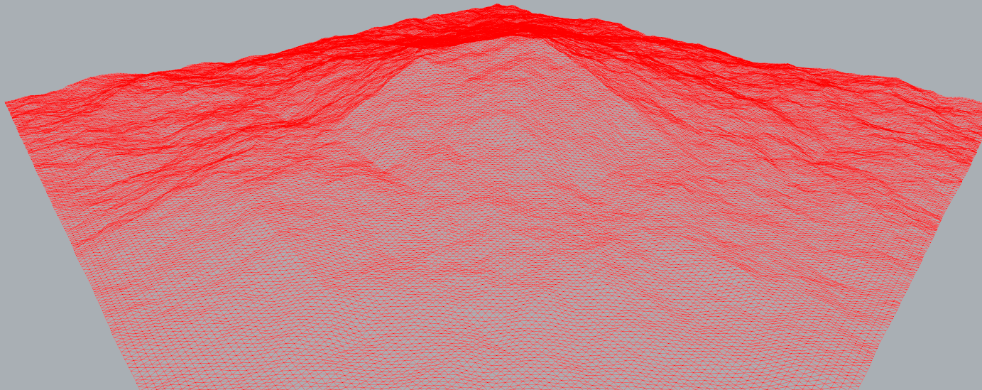 Diese 257×257-Heightmap wird rekursiv mit Rauschen aus einem kleinen Mersenne-Twister erzeugt; die Vertices werden einzeln auf der CPU transformiert; danach wird jedes Quad einzeln via DrawPrimitiveUP() zur GPU geschickt. Ein Drittel der Höhenwerte wird doppelt beschrieben weil ich faul bin. Das ganze läuft im Debug-Modus mit über 20 Hz auf meinem drei Jahre alten Core i7.