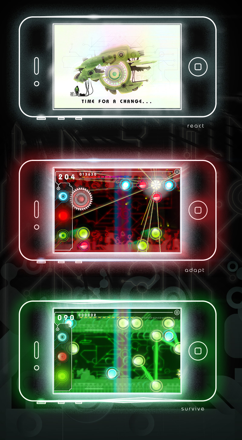 Wir haben bei dem Projekt unseren persönlichen Vorlieben und Interessen freien Lauf lassen können: Photoshop- und Illustrator-Verrücktheiten von Peter Wood, Gamedesign- und Mechanik-Experimente von Jörg Doneit, Code- und OpenGL-Stümpereien von mir, Bernhard Mies. Obwohl die Grenzen bei einem 3-Mann-"Studio" dann doch eher fließend sind...