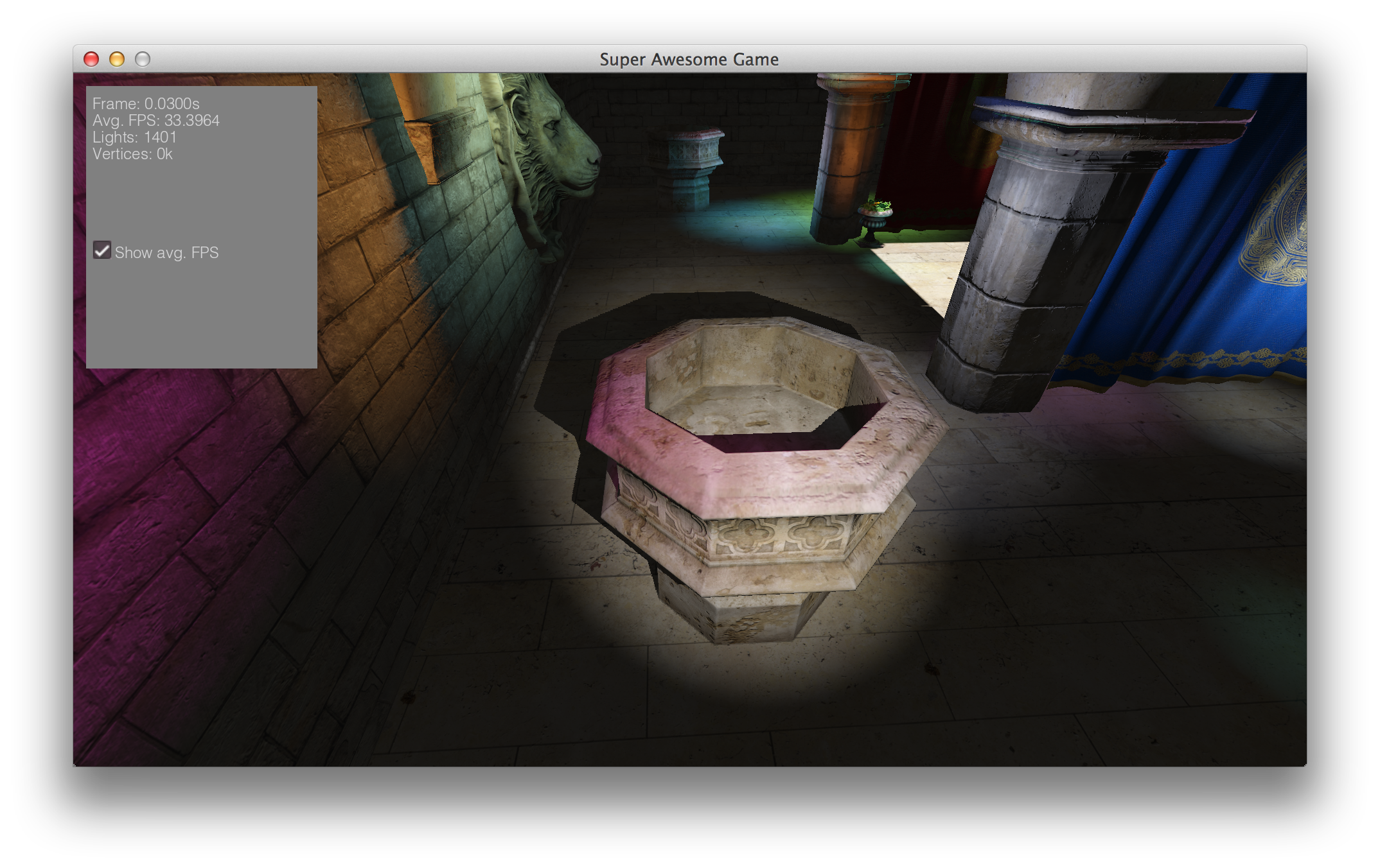 Die Debuganzeige zeigt im Moment nur die fps und Zeit korrekt an, in Wirklichkeit sind auf dem Screenshot 200 Punktlichter, ein Spotlight mit Schatten und ein direktionales Licht mit Schatten zu sehen: