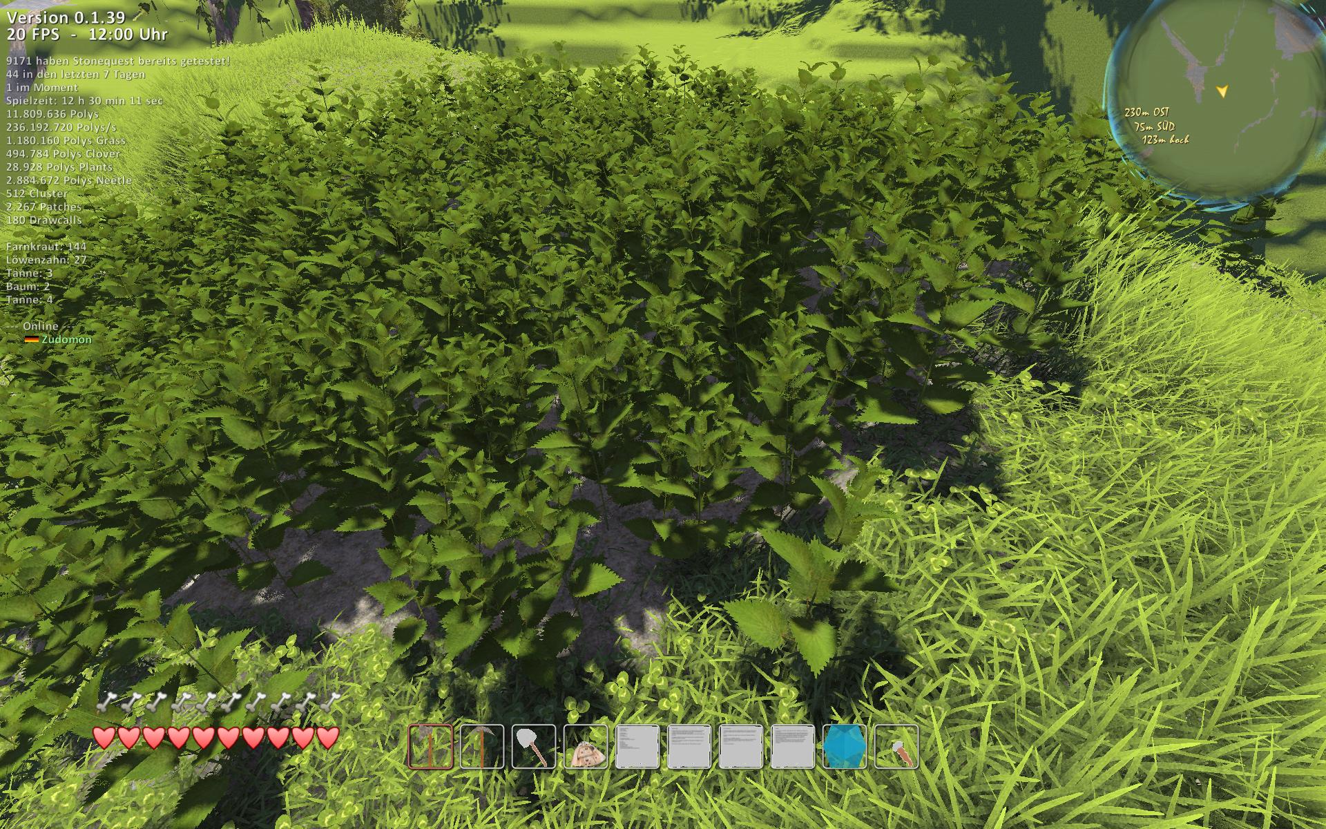 Das liegt daran, dass im Moment bei jedem Frame, bei jeder Fläche, für jede Pflanzenart berechnet werden muss, wie dicht da die Brennnesseln sind um dann zu entscheiden, ob da überhaupt noch Bewuchs möglich ist, und wenn ja, dann wird nochmal berechnet wie dicht an der Stelle die aktuelle Pflanzenart ist.