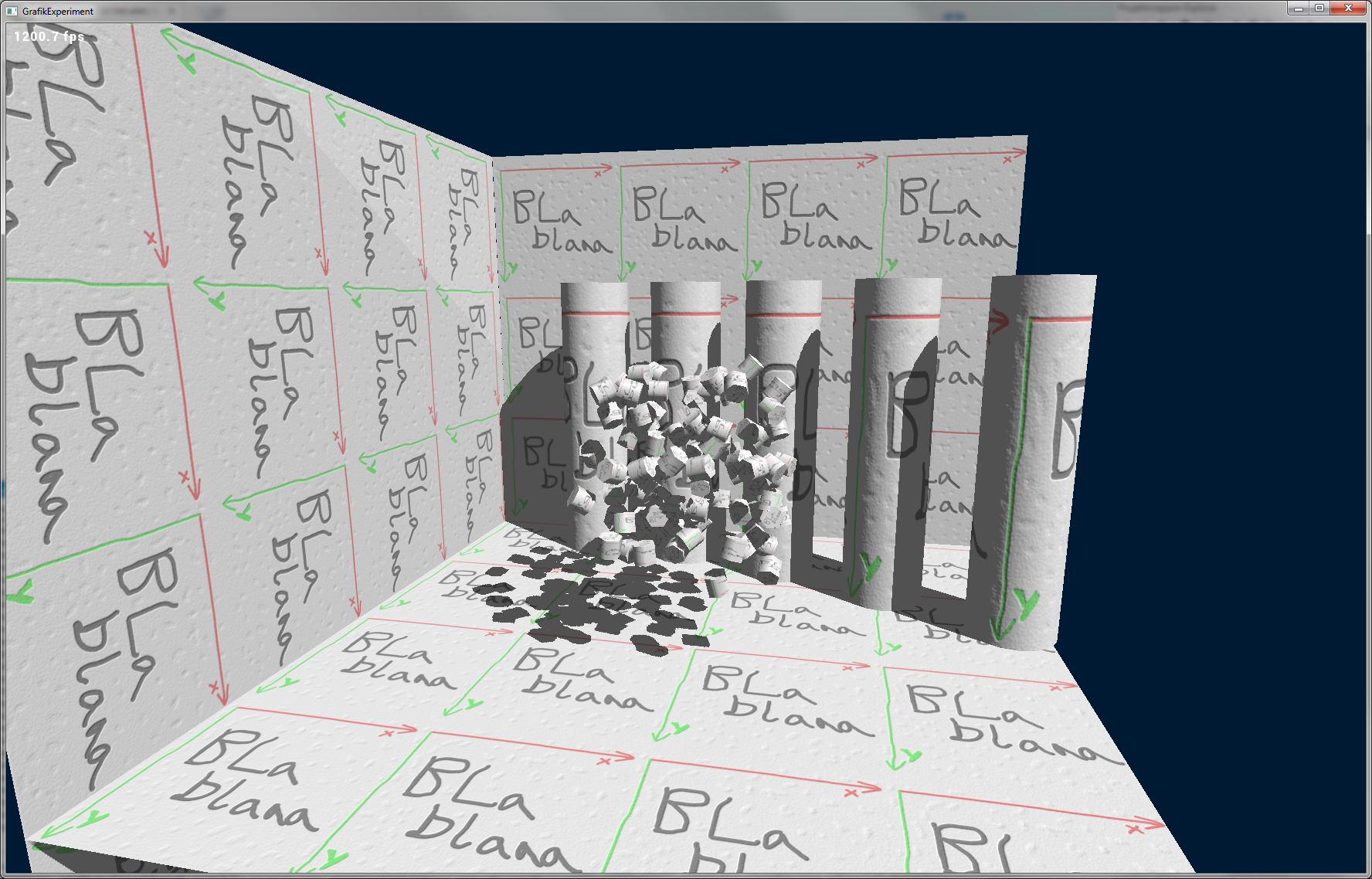 OpenGL: Direct3D9: Die Unterschiede, die mir spontan auffallen, sind der halbe Pixel Versatz, wie wir ihn von den DirectX9-Rasterizer-Regeln kennen - im Postprocessing und im Sprite-Renderer habe ich deswegen noch ein taktisches #if DirectX im Shadercode, das ich wohl erst mit dem Abschneiden von DX9 los werde. Auffällig außerdem die etwas schlechtere Performance von OpenGL - ich vermute, dafür ist meine recht naiv implementierte Befüllung dynamischer Buffer verantwortlich. Mit einer richtigen Szene mit nennenswert Inhalt muss ich mal umfangreich profilen. Und bei OGL heißt das leider auch: auf allen OS mit allen Grafikkarten getrennt.