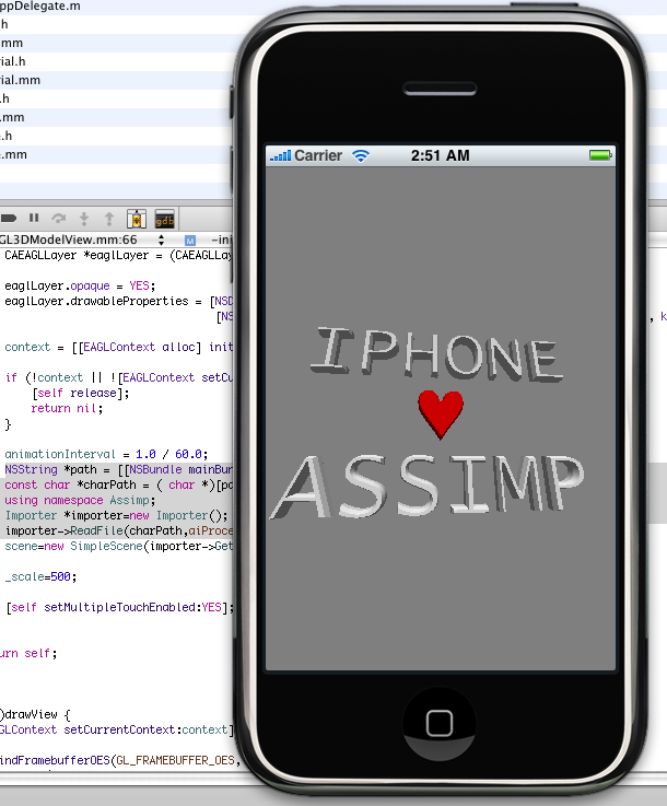 Da man beim iPhone auch mit C/C++ programmieren und C/C++ Bibliotheken einbinden kann, war es wirklich sehr einfach ASSIMP einzubinden. Dank des Boost-Workarrounds musste ich noch nicht einmal Boost auf dem iPhone zum Laufen kriegen. Da ich sehr faul war, habe ich auch kein build der ASSIMP Bibliothek zum linken gemacht, sondern einfach den Quellcode dem Projekt hinzugefügt. Das einzige was ich jetzt noch machen musste war ein paar kleine Wrapper-Klassen zu schreiben, die mir dann VBOs erstellen, Texturen laden, Rendern usw.. Und die werde ich hoffentlich bald online stellen können :D.