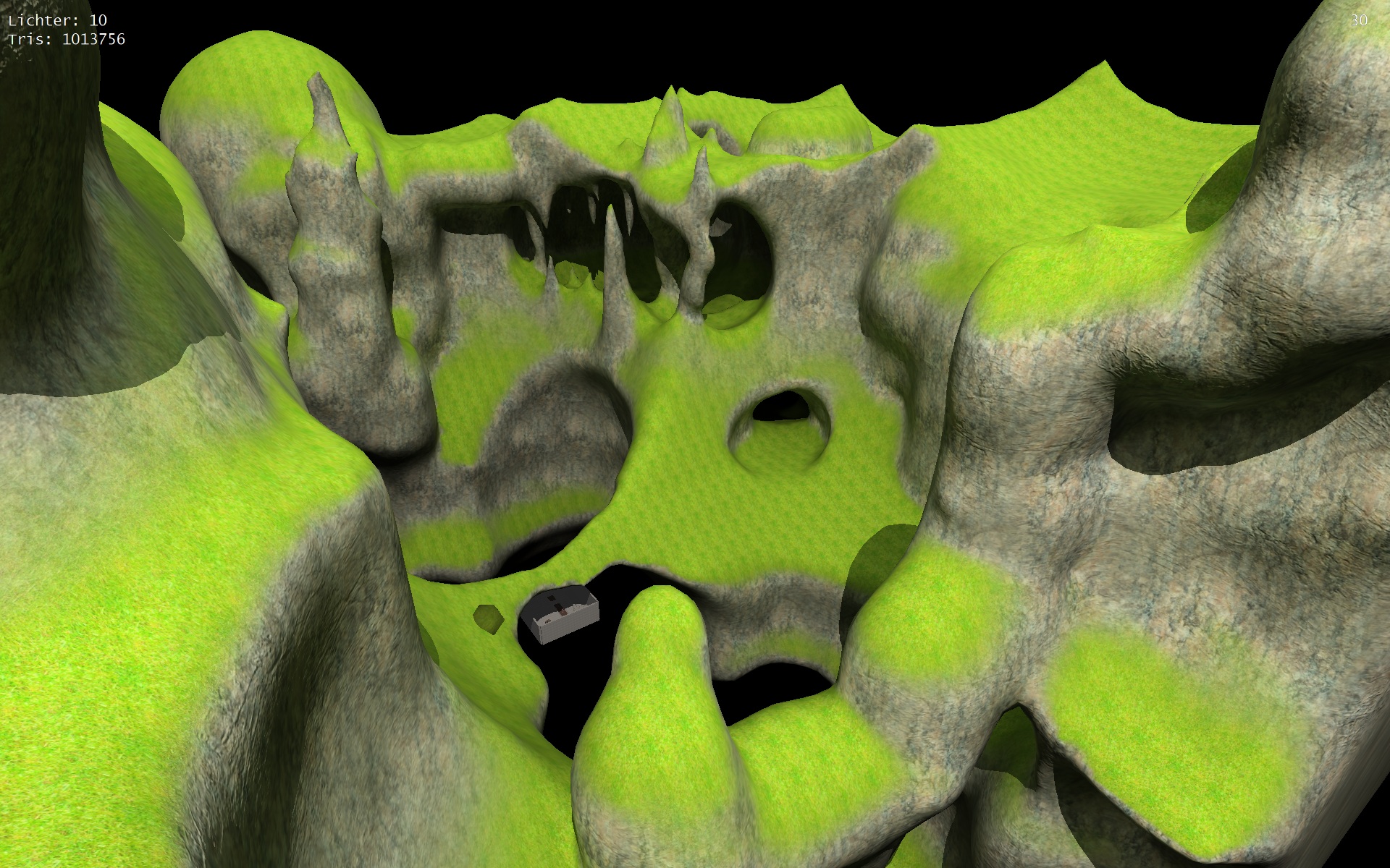 Also das zugrunde liegende Grid war 96x64x96. Im Hintergrund oben in der Höhle sieht man so einige Zapfen, da ist etwa auch die Auflösungsgrenze erreicht, detailierter geht es über das Grid nicht.Schrompf hat geschrieben:Wie gezielt kann man damit Landschaft formen?