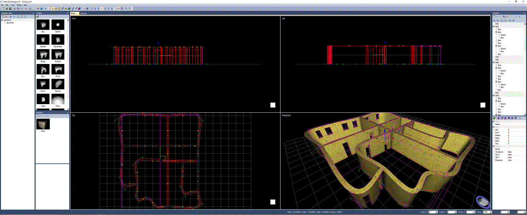 Nach langer Pause schreibe ich wieder am SCD. Jetzt ist es möglich Wände nicht nur Linear sondern auch als Spline oder Bezierkurven zu interpolieren. Ein Screenshot soll es demonstrieren. An den orangenen Knuppeln dürft ihr euch nicht stören die werden noch linear positioniert. Im Screenshot habe ich Bezier automatisch aus Linear erstellt. Das geschieht einfach beim ändern des Segment-Types.