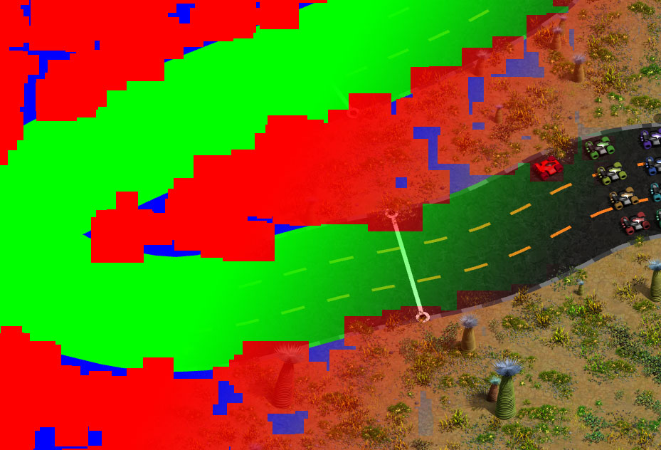 bei der umstellung auf die 3 layer variante habe ich auch noch einen single-color-shader für jedes layer erstellt, damit ich sehen kann obs richtig funktioniert. links sind die 3 schichten erkennbar (blau hintergrund, grün strecke, rot objekte) und rechts so wie das resultat mit einem anständigen shader ausschaut.