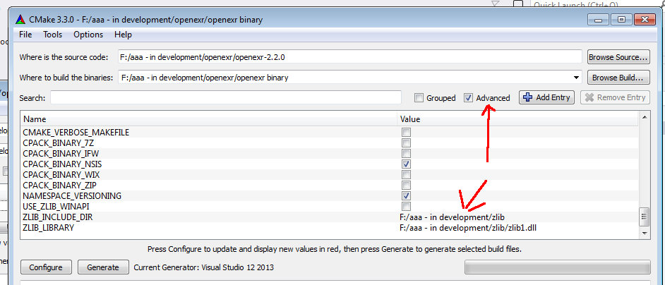 Dabei Zlib Pfade unter Advanced anpassen und einen Eintrag mit Namen ILMBASE_PACKAGE_PREFIX mit Type PATH und Value Z:/ilmbase_install über den Button Add Entry hinzufügen.