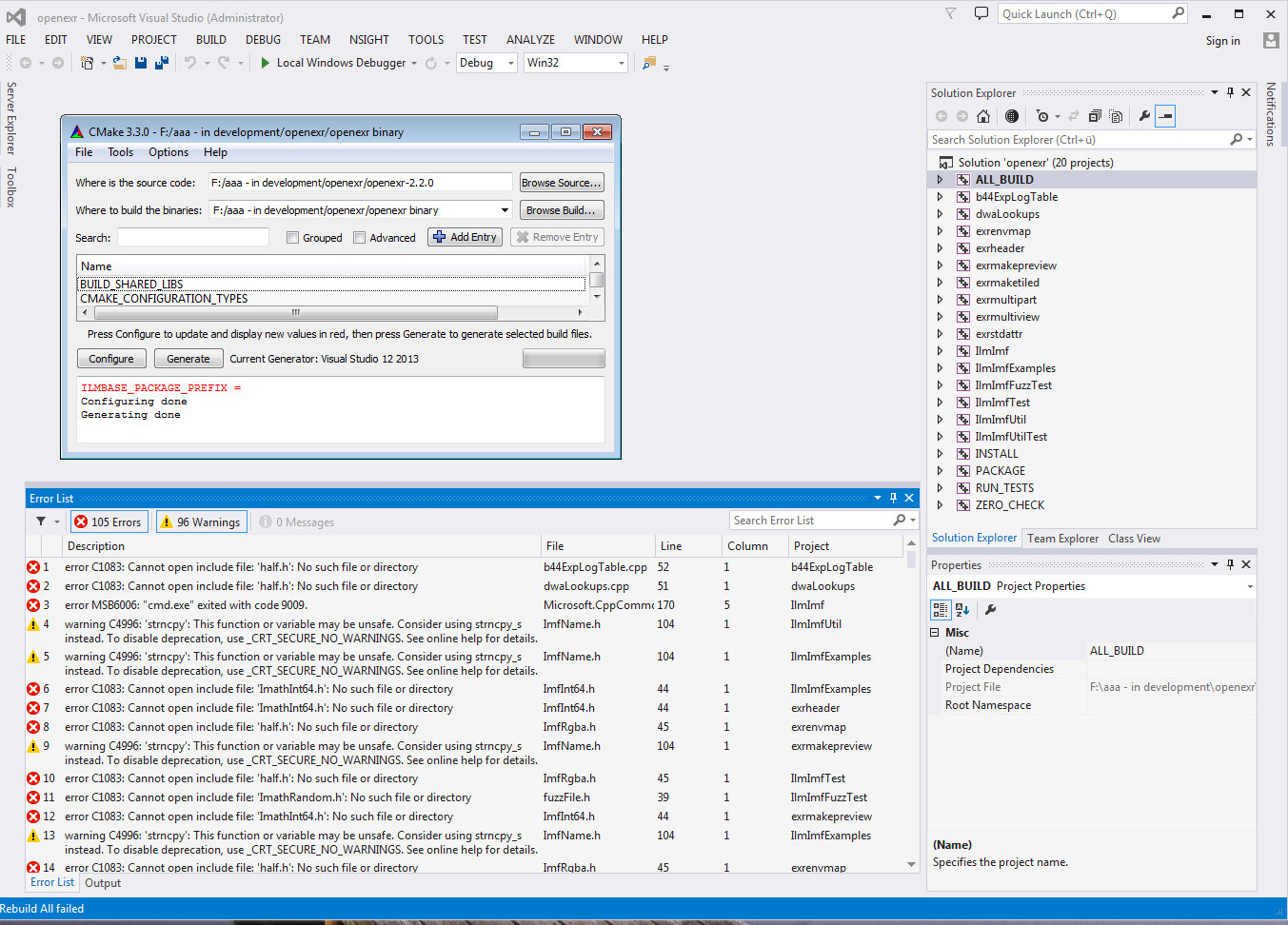 Und das Build in VS schmeisst mir 105 Errors. Und weil ich nicht glaube dass die Releaseversion von OpenEXR mit so vielen Bugs gesegnet ist gehe ich mal davon aus dass ich wohl obigen Eintrag noch fixen muss ^^
