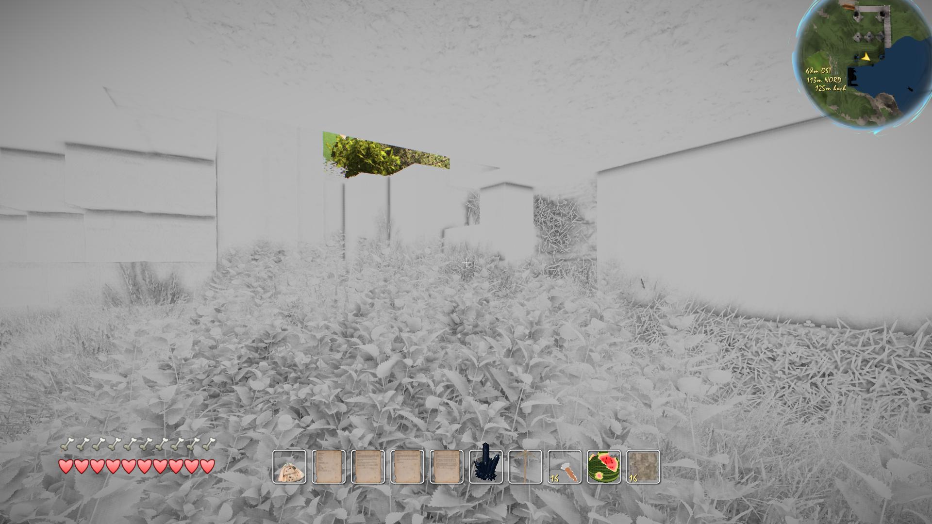 Grassfarbe bzw. ausblenden ist nur per shader. Vielleicht deswegen. Modelle können nur in der höchsten Landschaftslod existieren, bis jetzt. Deswegen sieht der Hintergrund so kahl aus. Außerdem sind da noch Bäume und Wurzeln, die blöderweise pro lod anderen seed haben. Auch wenn es nicht so aussieht aber durch die Lods müssten es schon weit über hundert objekte sein. Materialien sind es auch schon über hundert. Da ist das konsistent halten schon eine Herausforderung.