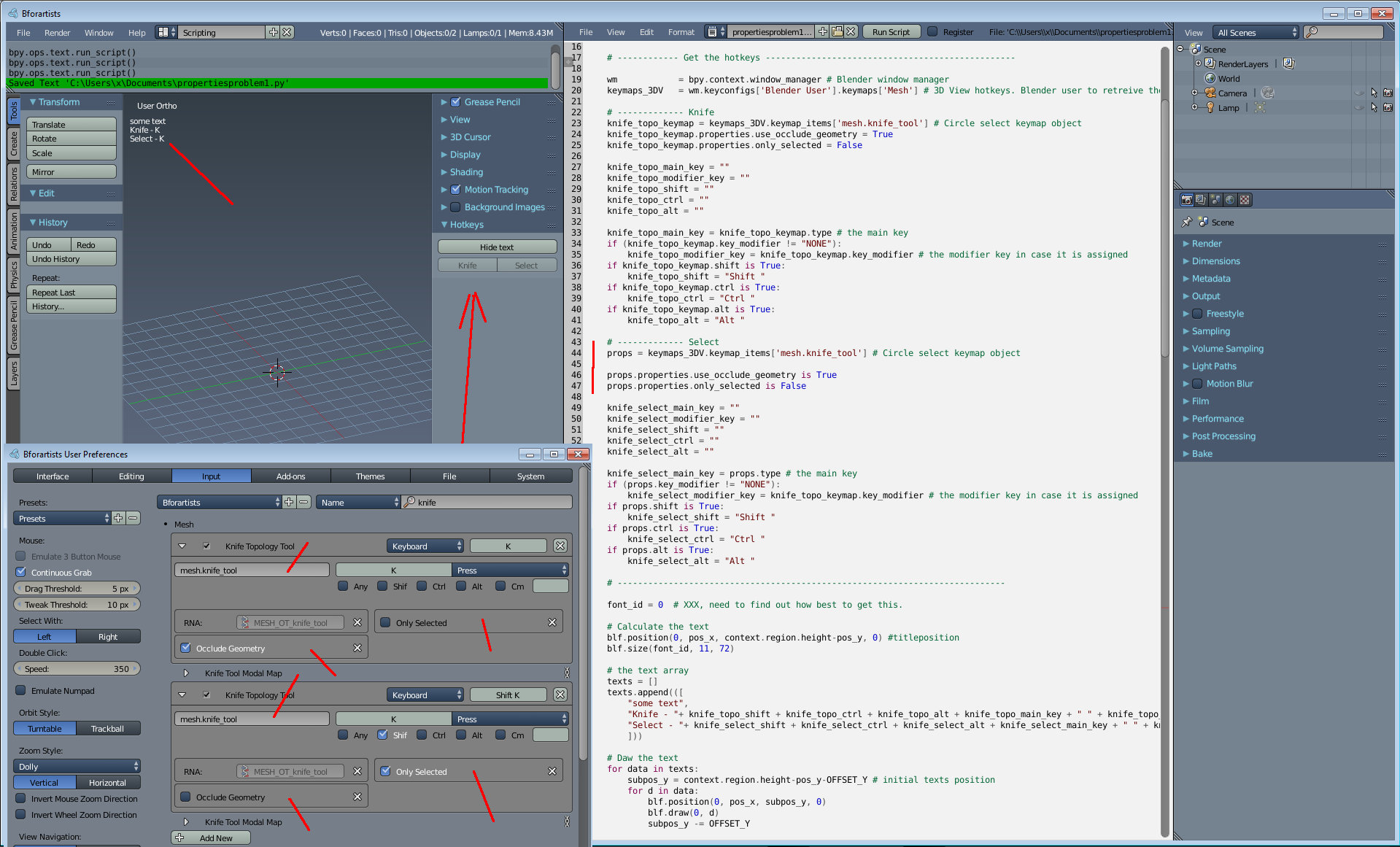 Identifier ist beides mal mesh.knife_tool. Unterschiedlich sind die Flags only_selected und use_occlude_geometry. Ich habe zwar inzwischen jeweils für sich Zugriff auf diese Properties, siehe weiter unten. Aber ich bekomme die zwei Tools einfach nicht sortiert. Egal was ich probiere, mir zeigt es immer nur den ersten Hotkey an. Was mir fehlt ist das Ganze dem Identifier zuzuweisen, damit dann auch wirklich das Tool mit dem richtigen Hotkey an der Strippe ist.