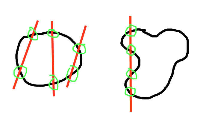 Konvex bedeutet hier, dass wenn man durch das Lichtvolume schaut es immer genau einmal betreten und einmal verlassen wird (bzw. dass man am Ende auf Geometrie stößt), die Sichtlinie also exakt zwei Schnittpunkte mit dem Volume hat (links im Bild). Bei konkaven Volumes kann unter Umständen das Volume mehrfach betreten und verlassen werden (= mehr als 2 Schnittpunkte), wie rechts im Bild zu sehen.
