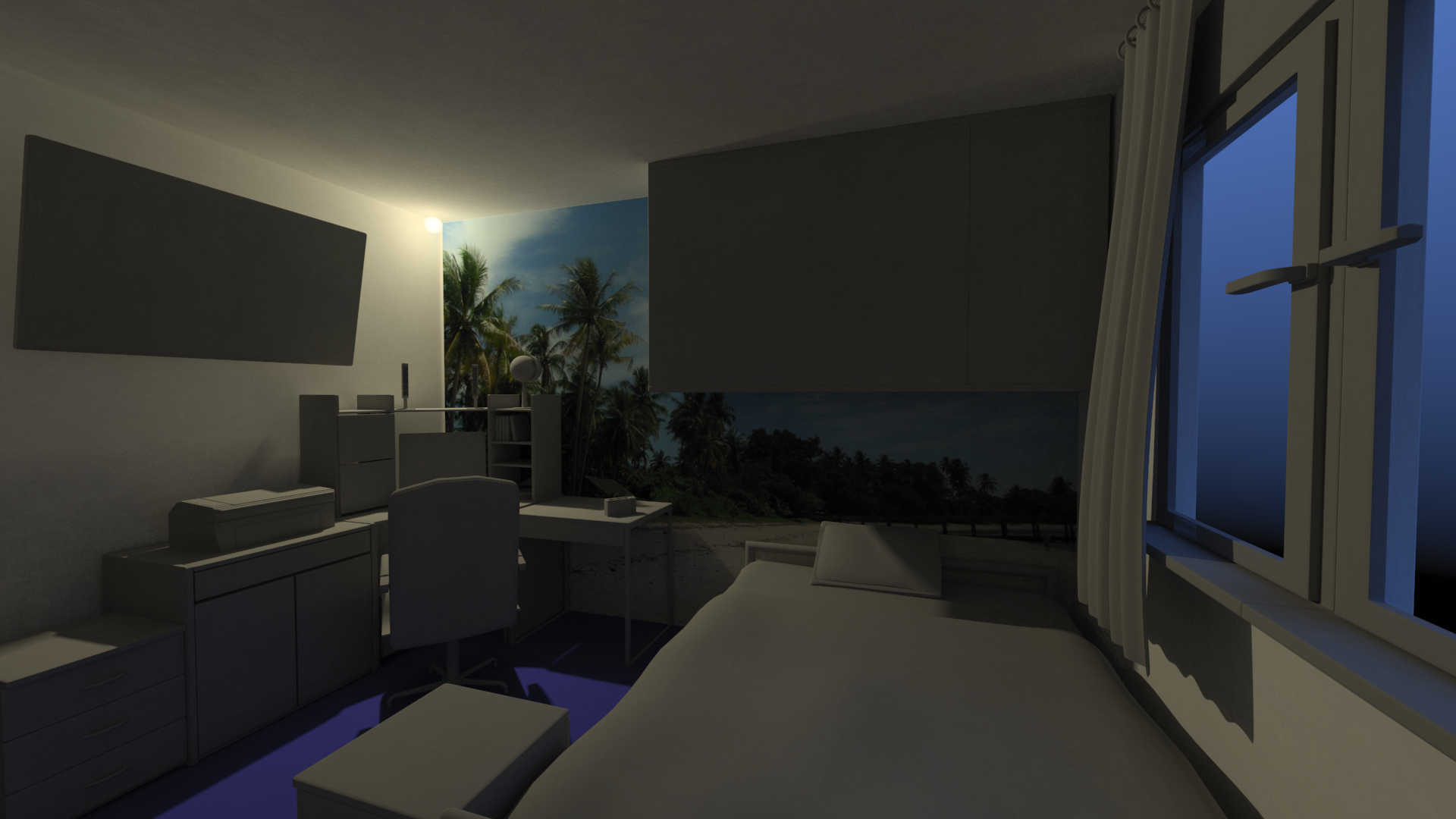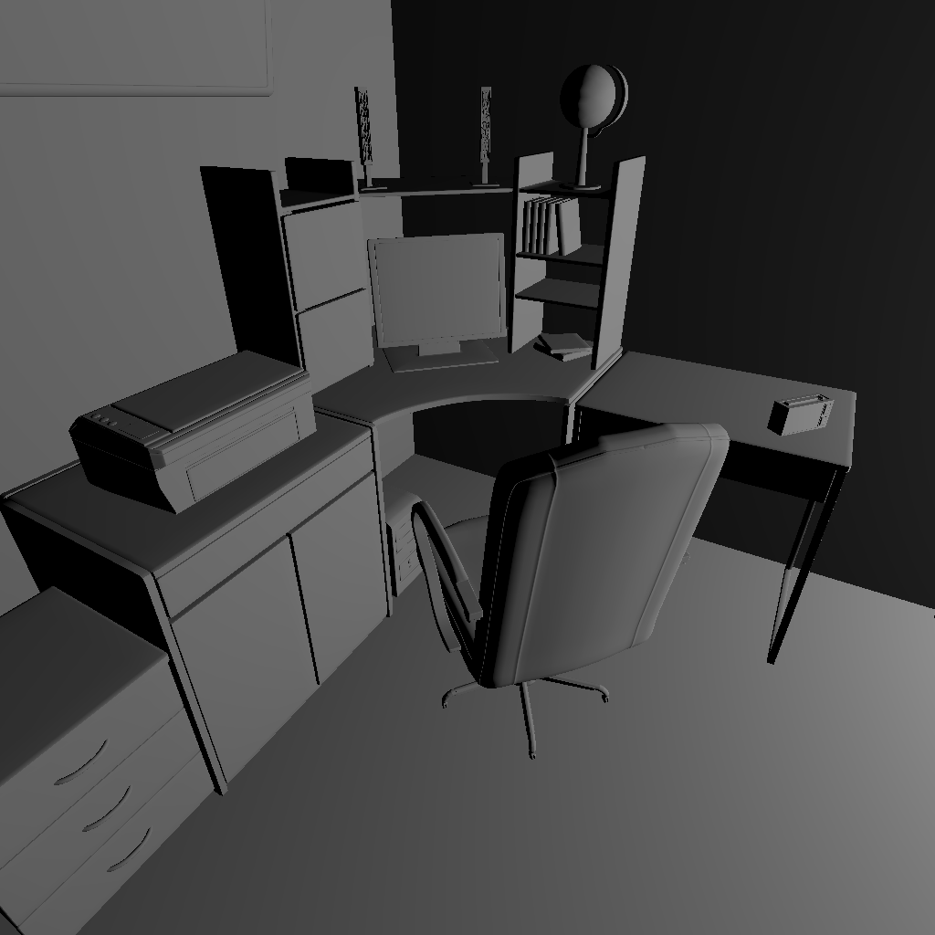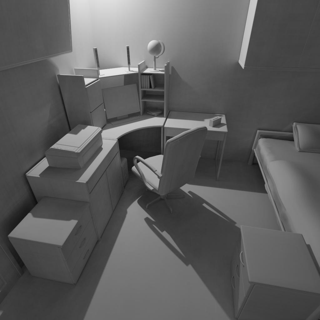 Aber das Ergebnis scheint noch falsch zu sein. Wobei ich glaube, dass das Licht immer noch nicht richtig streut. Vor allem da oben rechts sieht es falsch aus, wo der Schatten des Schrankes die Wand trifft.