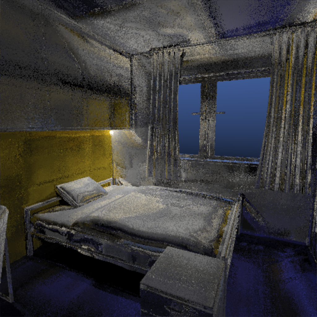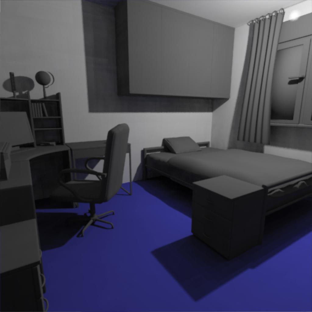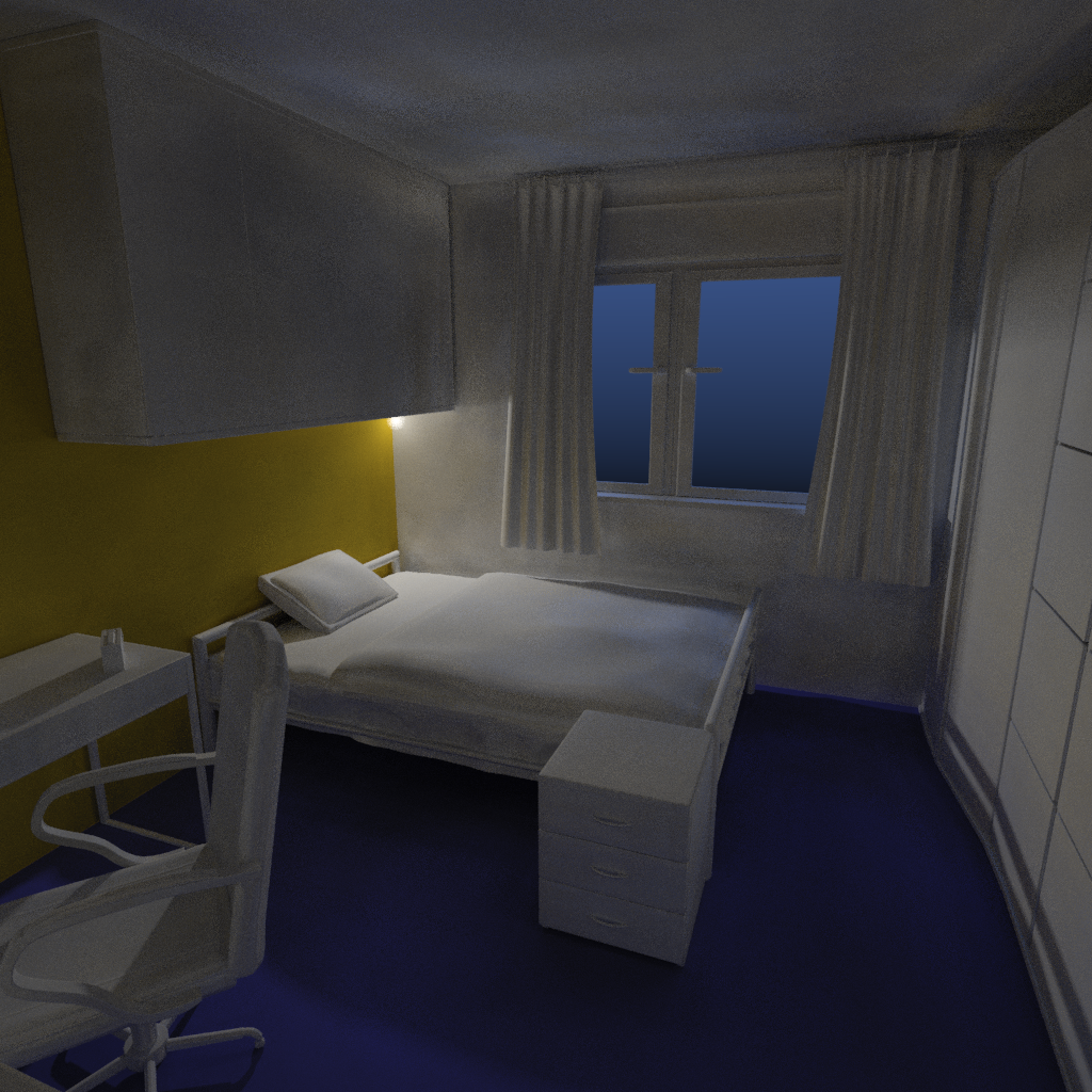 Hier ist noch eins, welches 1005 Sekunden Renderzeit hatte, auf 1024². Das ist schon extrem lang. Das Problem bei diesem Bild ist, dass die Lichtpfade nur selten durch das Fenster fallen, deswegen dauert das konvergieren dann so lange. Hier würde wohl Metropolis Light Transport helfen, aber ich glaube, so weit werde ich nicht mehr kommen.