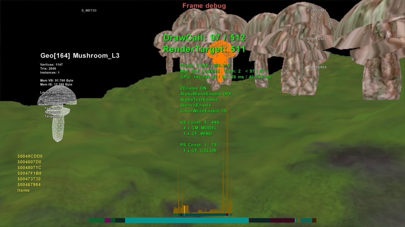 Es werden redundatente States gefiltert, bevor sie nach DX geschickt werden. Also zwischen den Drawcalls werden faktisch nur die Shaderkonstanten gesetzt, die auf den Bildern zu sehen sind, CF_... CM... usw.Krishty hat geschrieben:Setzt du auch die States vor jedem Pilz, und dabei vielleicht andere als für die Bäume?