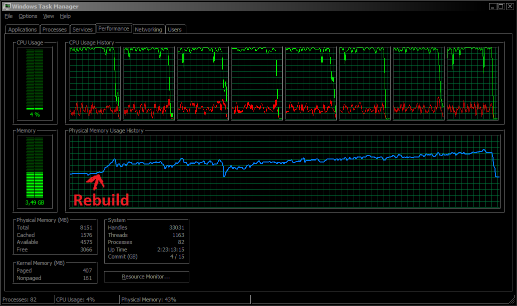 Das viele Kompilieren macht einen kirre. Ich habe so schnell wie möglich Visual C++’ Multi-Threaded Compiler aktiviert, aber trotzdem dauert ein Rebuild fast 15 Minuten mit acht Kernen à 3 GHz, und verbraucht über 3 GiB RAM. Im Jahr 2006 haben die Entwickler sicher den ganzen Tag kompilieren müssen.