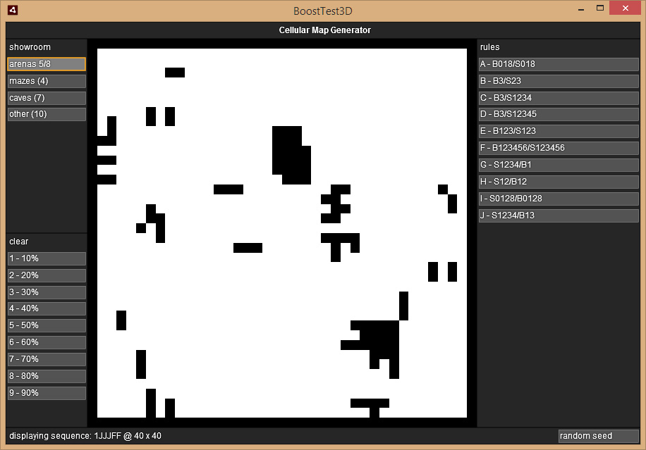 Die Regeln sind eher zufällig herausgepickt/ausprobiert. B ist z.B. das original Game of Life. Eigene Regeln kann man hier jetzt nicht eingeben. Wie die Regeln zu interpretieren sind, und wie der Automat funktioniert steht in der Wikipedia, von daher lässt sich das auch in 5 Minuten nachcoden. Ich halte das für ausbaubar, mit Bildfiltern, Masken, Fülloperationen, Analysewerkzeugen usw. und/oder einfach nur als Grundlage in einem Editor.
