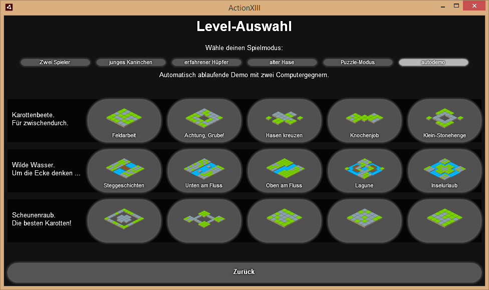 - Die KI konnte ich durch automatische Anpassung an den jeweiligen Level etwas schneller machen, zumindest für die kleineren Level. Default bei der Entwicklung ist außerdem eine Autorun-KI, um neue Level automatisch durchtesten zu lassen.