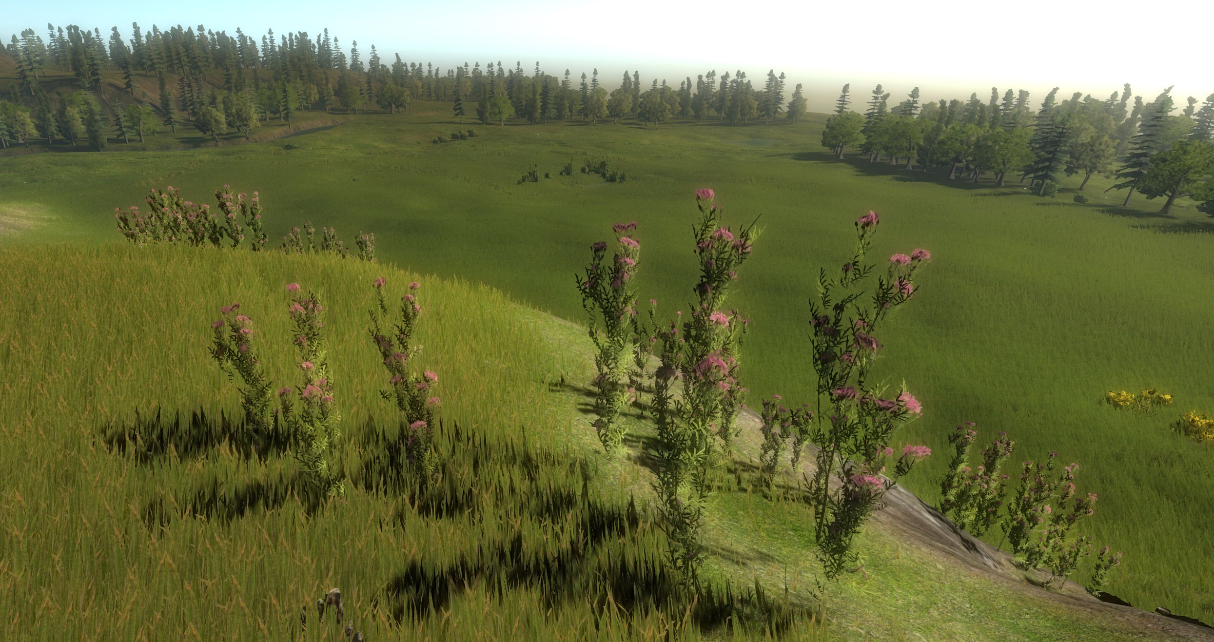 Sneak-Peak unseres neuen Props-System, das zuaellig kleinere Ziergegenstaende auf dem Terrain verteilt. Im Gegensatz zu Terrain und Baeumen, fuer die wir eigenes Rendering betreiben, handelt es sich um ganz normale Unity Prefabs die noch nichtmal instanced sind. Stellt aber kein zu grosses Performanceproblem da nachdem der Rest der Landschaft quasi nix kostet (und man auf langsameren Rechnern auch einfach darauf verzichten kann).