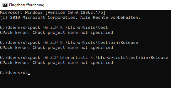 Ich vermute ja mal dass das Cpack über die Commandline aufgerufen werden muss. Aber da komme ich nicht zum Ziel. Siehe Anhang. Wo und wie gebe ich denn da einen Projektnamen an? Bin ich da überhaupt auf dem richigen Dampfer?