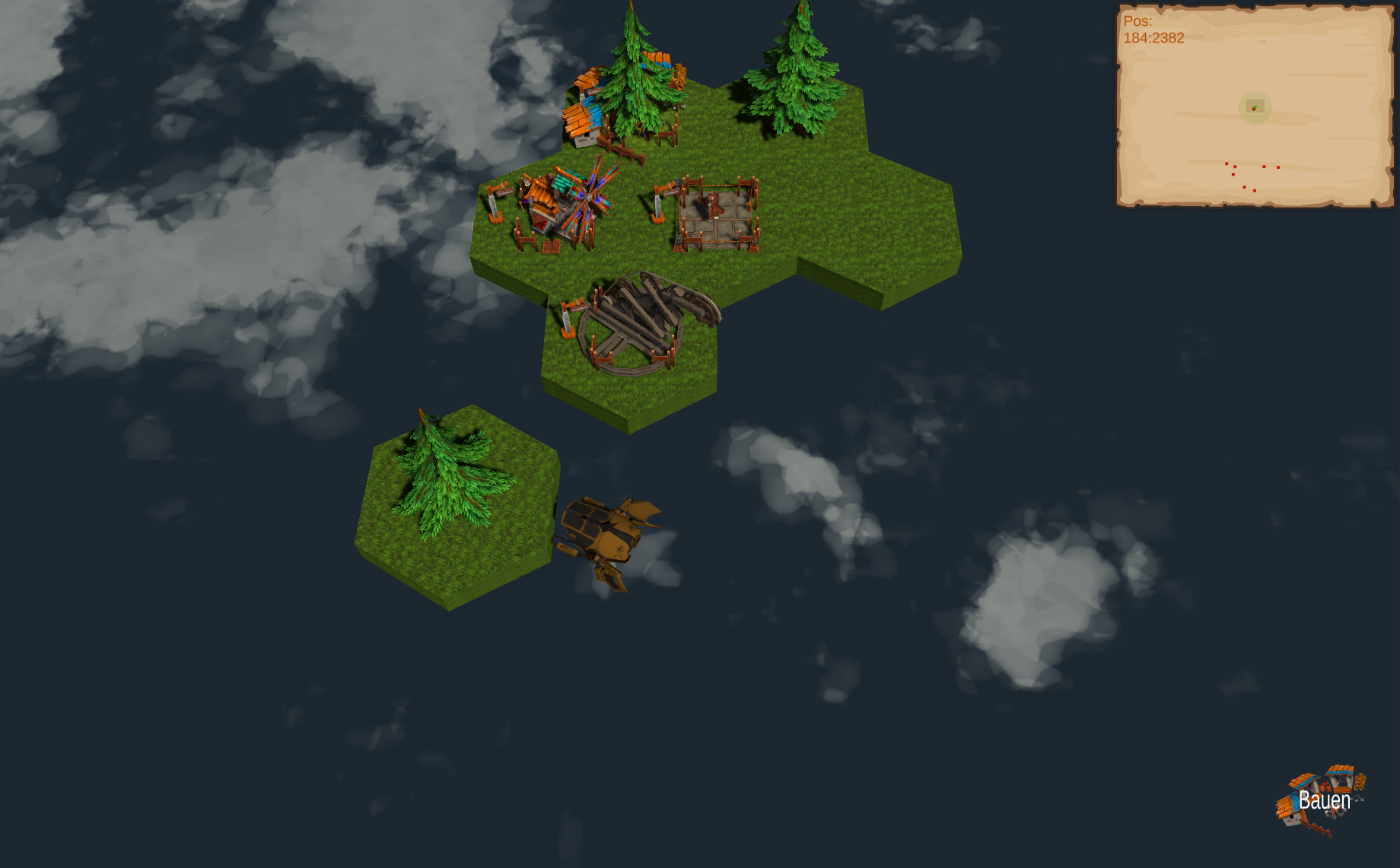Mit der Darstellung der Wolken bin ich auch schon recht zufrieden. Gebäude können nun gebaut werden (hier hab ich im Frontend noch einen Bug, dass mir die Darstellung der Baustelle nicht gelöscht wird ;) )