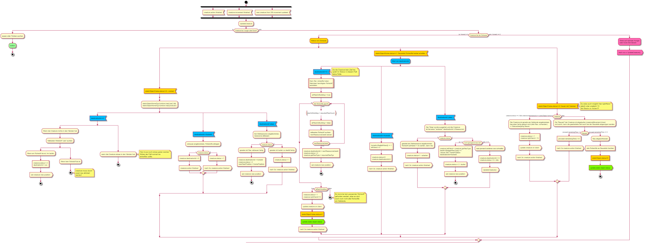 Den riesigen Programmablaufplan, den ich in dem Bildchen vom vorletzten Post hatte, habe ich schon wieder über den Haufen geworfen. Meine CreatureAI hatte mit über 1000 Zeilen Code, den Meisten in einer großen Funktion, schon wieder recht unübersichtlichen und schwer wartbaren Code. Mit dem Ablaufplan konnte man sich zwar recht schnell zurecht finden und die richtige Stelle im Code finden, um neue Funktionen hinzu zu fügen, aber alles recht wenig intuitiv :(