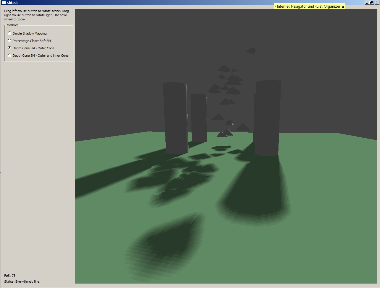 Die vorgeschlagene Kegelprojektionstechnik wurde in einem Prototypen implementiert. Dieser Prototyp implementiert einfaches Shadow Mapping, NVidias Percentage Closer Soft Shadow Mapping und die beschriebene Technik Depth Cone Shadow Mapping. Auch die beidseitige Variante ist implementiert, aber nicht gepflegt - die Ergebnisse davon sind definitiv unbrauchbar. Ich werde diese Variante evtl. noch bis zur Benutzbarkeit bearbeiten, aber das ist unsicher - aufgrund der prinzipiellen Probleme von Shadow Mapping wird die beidseitige Variante definitiv immer Light Bleeding-Artefakte enthalten, weswegen ich sie für den praktischen Gebrauch für untauglich halte.
