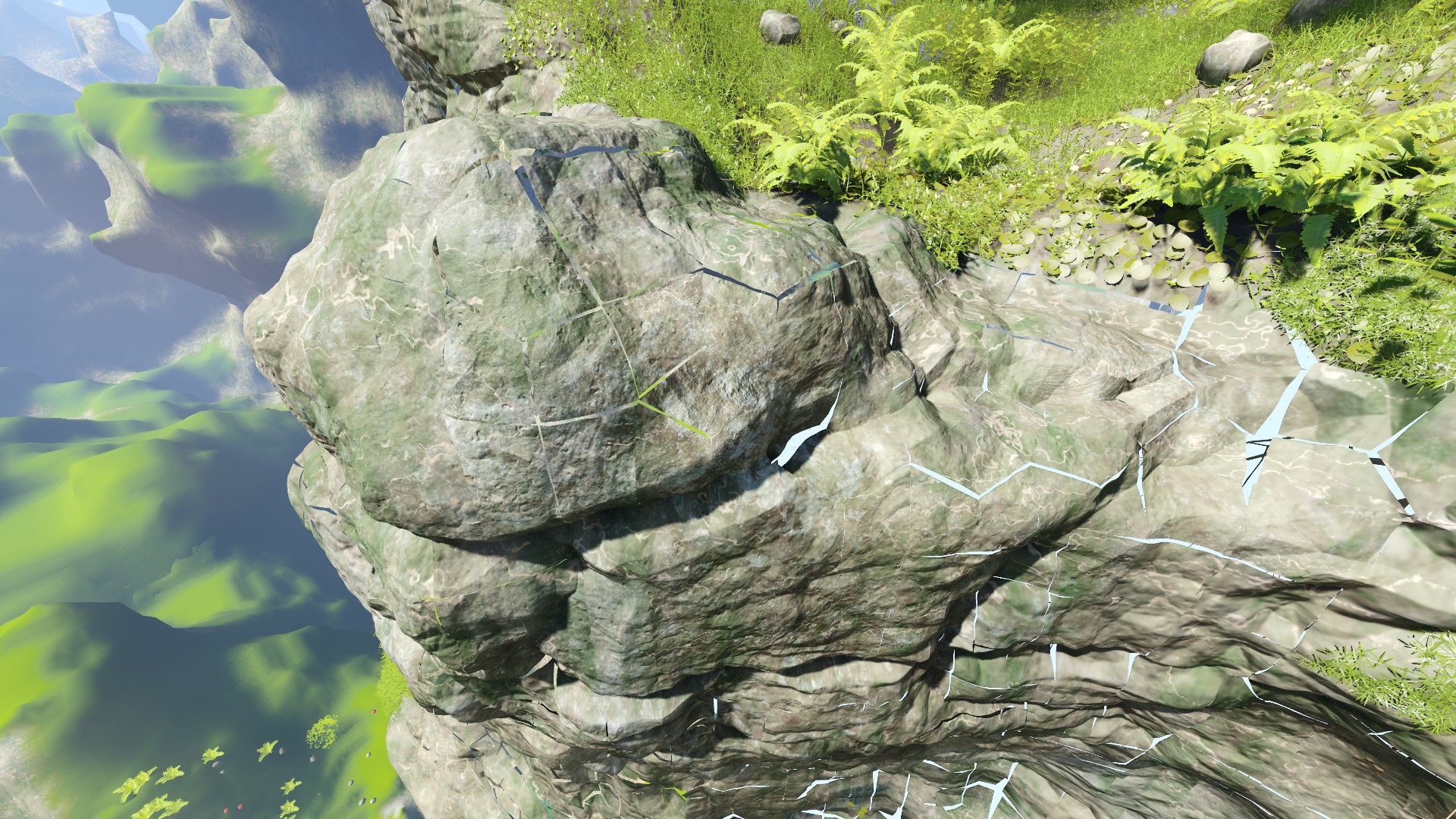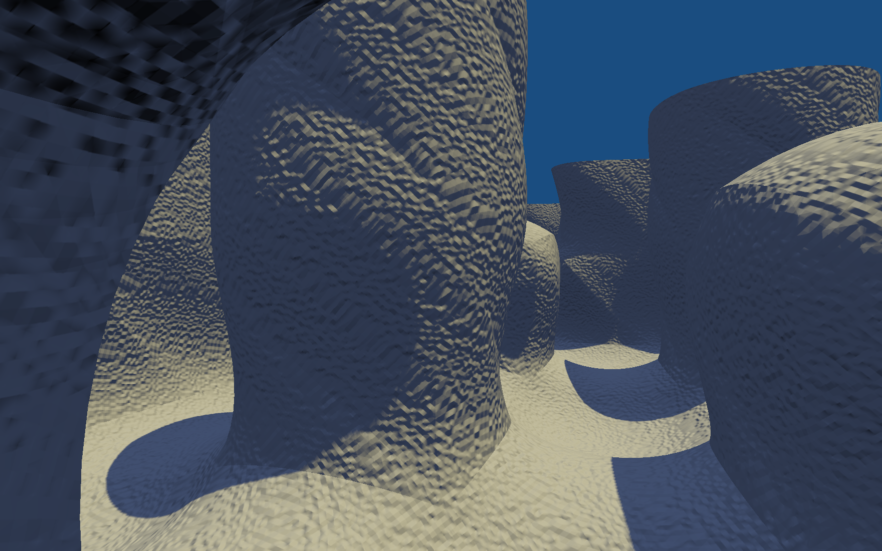 In 3D ist es natürlich gravierend, wenn dann der Himmel durch die Welt scheint: Schrompfs Idee, die Normalen für das Displacement stetig zu konstruieren, ist ein guter Ansatz dem entgegen kommen. Damit bleibt dann die Geometrie trotz Displacements schön bündig.