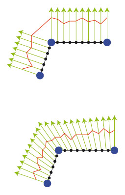 Normalen des Ursprungsmeshes: oberes Bild, grün. Wenn man jetzt das Mesh in kleinere Faces (schwarze Punkte) unterteilt und per Noise-Wert die neuen Punkte entlang der Flächennormalen verschiebt (rot=neue Oberfläche), entstehen hässliche Verzerrungen an den Ecken und Kanten.