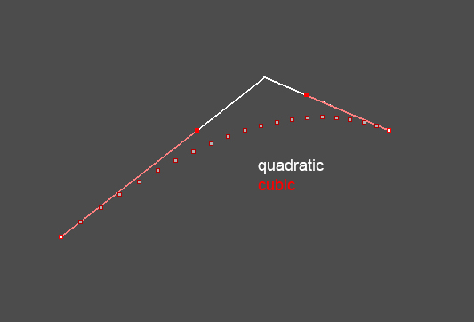 ich habe einen Algorythmus( Formel ) entwickelt bei der man aus einem quadratischem Spline eine kubische Bezierkurve machen kann. DIe Bezierkurve läuft bei 0 und 0.5 und 1.0 durch die selben Punkte wie das quadratische Spline. Leider aber nicht bei allen anderen Werten, hier weicht sie davon ab.